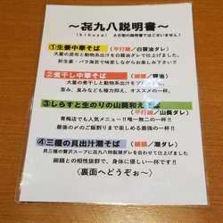 | メニュー | メニューの写真を見る 【あっさり!! 白醤油+塩ダレ/平打麺】 |